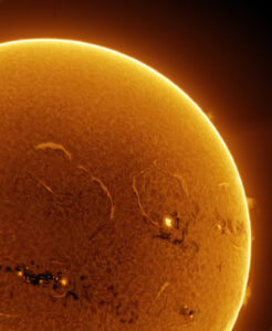 La tache claire que vous voyez à droite est la tache solaire visible à l’oeil nu actuellement (avec les PRECAUTIONS d’usage); c’est la région active 3879.
