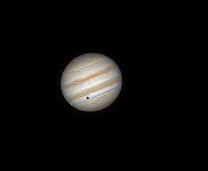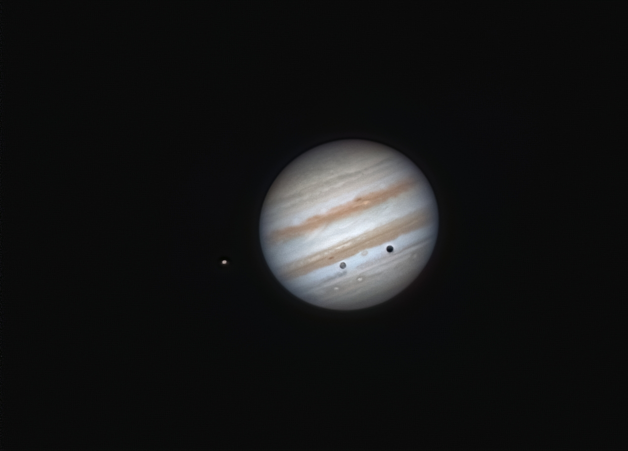 Une heure plus tard, la rotation (rapide) de Jupiter est mise en évidence avec le déplacement du satellite et de son ombre. Un autre satellite Io est visible alors qu’il venait de sortir de derrière la planète géante.