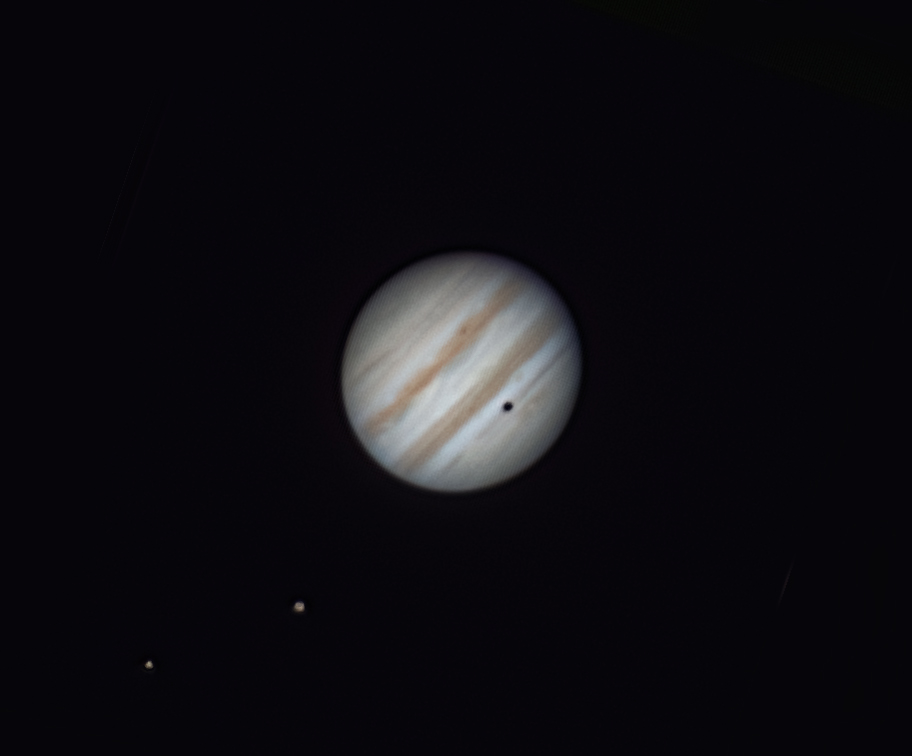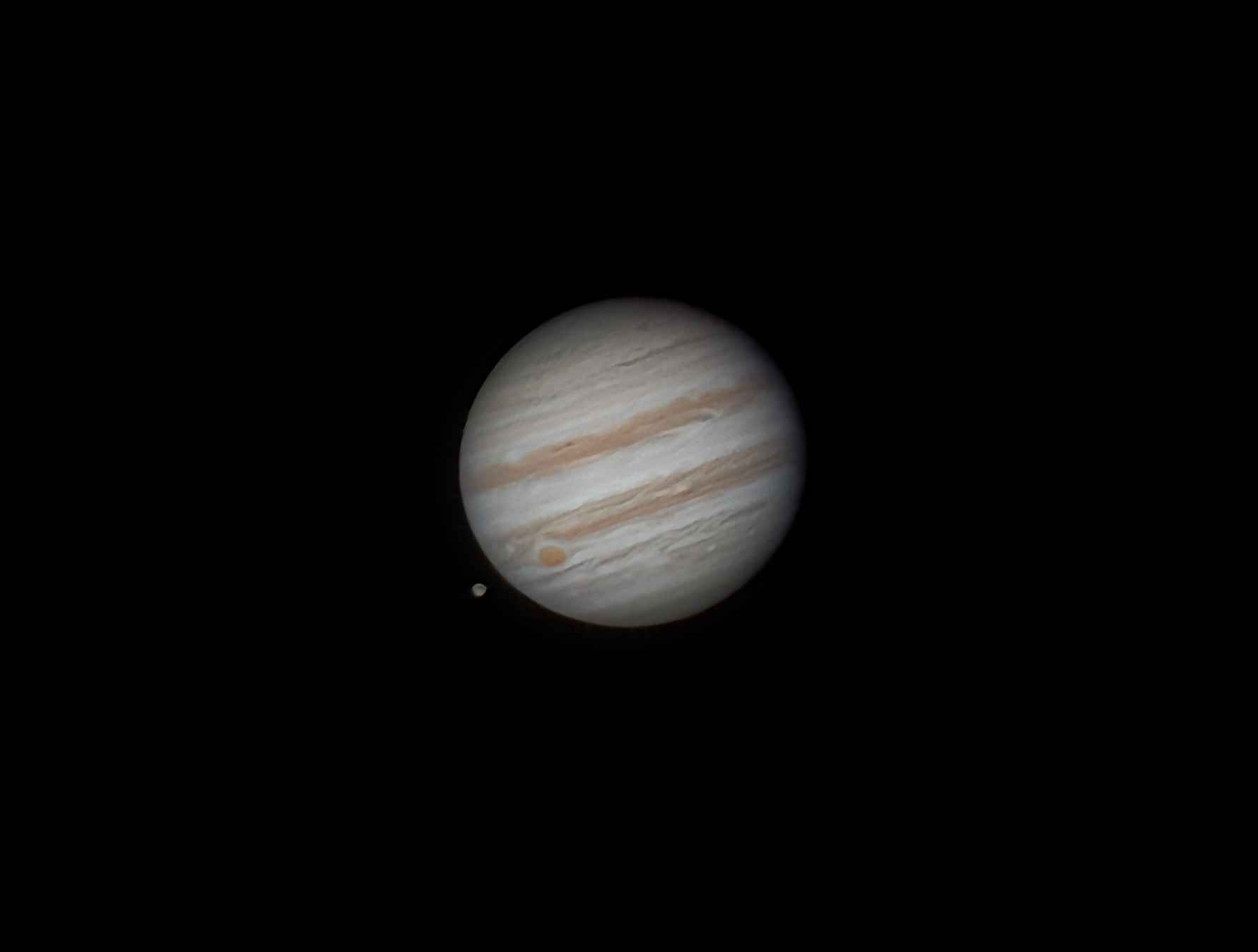 Capture de cette nuit alors que le satellite Ganymède s’apprête à traverser le disque jovien et que le gigantesque anticyclone (Grande Tache rouge) surveille ! 😉