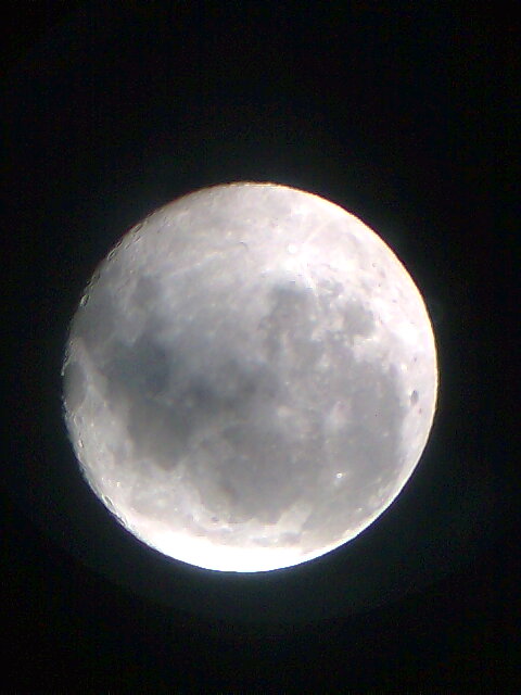 Ce 20 juillet à 3h30, j’ai fait une photo de la Lune avec mon GSM et mon Newton 200/1000 et un oculaire de 25.