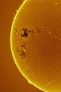 Vidéo de 35s à la vitesse de 15 images/s. J’ai pris les 30% des meilleures images de la vidéo que j’ai ensuite assemblé pour ne faire qu’une seule image. J’ai alors inversé les couleurs pour que la région active apparaisse sombre (elle est normalement bien brillante et blanche) et pour mettre en évidence les structures tortueuses dues au champ magnétique.
