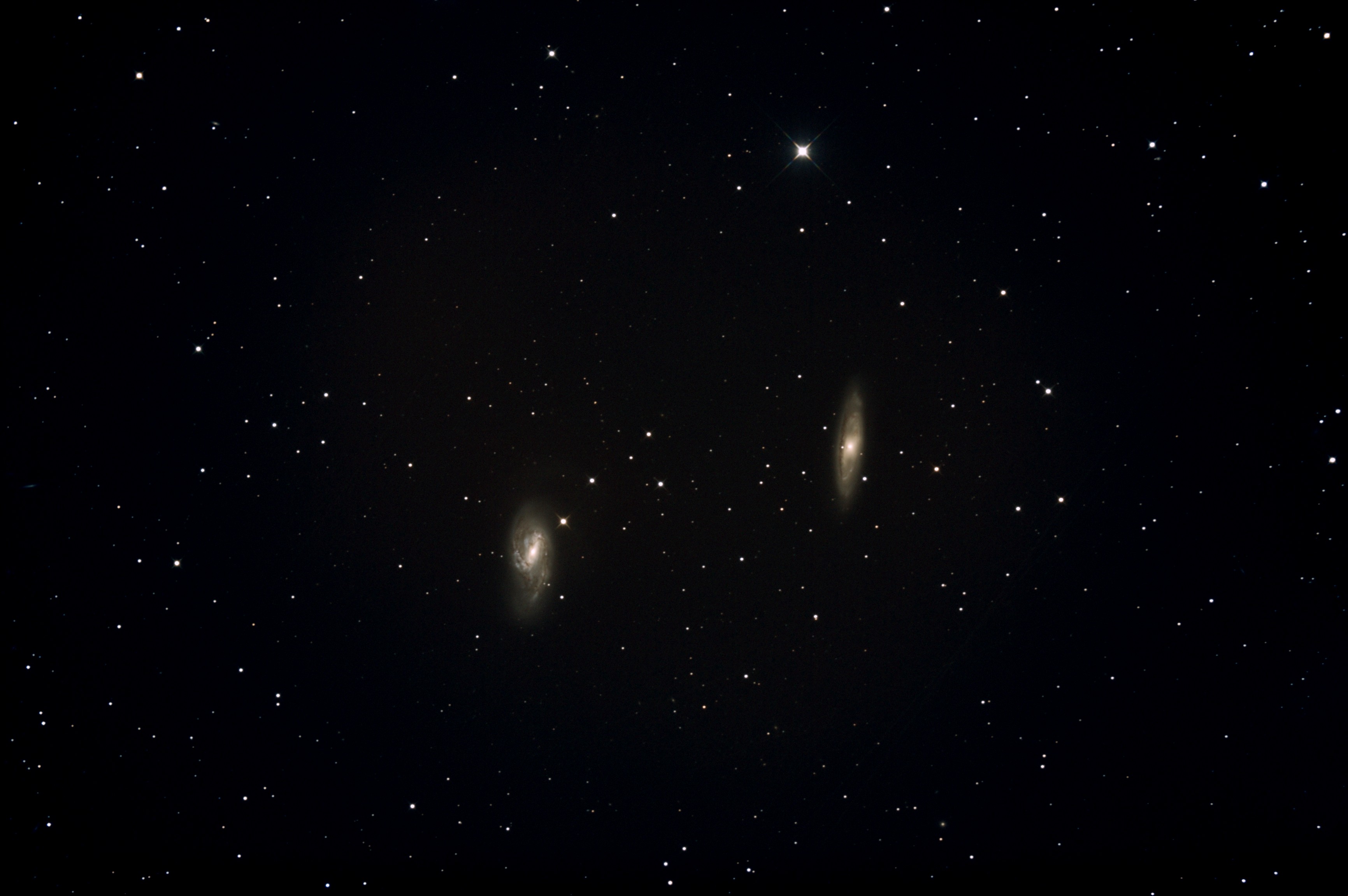 Après une longue absence, je me réjouis de vous proposer un cliché du classique duo du Lion capturé avec le boîtier Canon 350D ce 5 mai 2008 à Harzé. Cette image résulte de l’addition de 11 poses de 10 minutes avec le Canon 350D modifié au foyer du CN212 en configuration Newton et équipé d’un correcteur de coma PARACORR (filtre UHC-S, correction noir incluse, DDP sous IRIS et autoguidage à l’aide d’une petite caméra CMOS noir et blanc de 1.3 Mpixels et du logiciel GuideMaster).