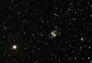 je vous présente un cliché de cette belle mais petite nébuleuse planétaire située dans la constellation de Persée. Elle a été photographiée depuis l’observatoire Sirène (Lagarde d’Apt, Vaucluse) avec ma CCD Sbig ST10XME placé sur mon C11 muni du réducteur de focale à F6.3, le tout sur la monture NJP le 25/09/2014. L’image est en mode RVB et résulte de l’assemblage de 7 poses de 5 minutes en binning 2×2 pour chaque couche.
