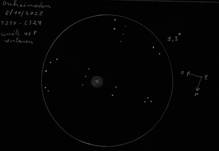 Pendant la journée, j’avais eu un contact « WhatsApp » avec Manu et avais évoqué mon observation de la comète 38P. Il m’avait répondu en me recommandant les comètes 46P « Wirtanen » et 64P « Swift-Gehrels »