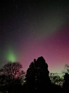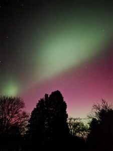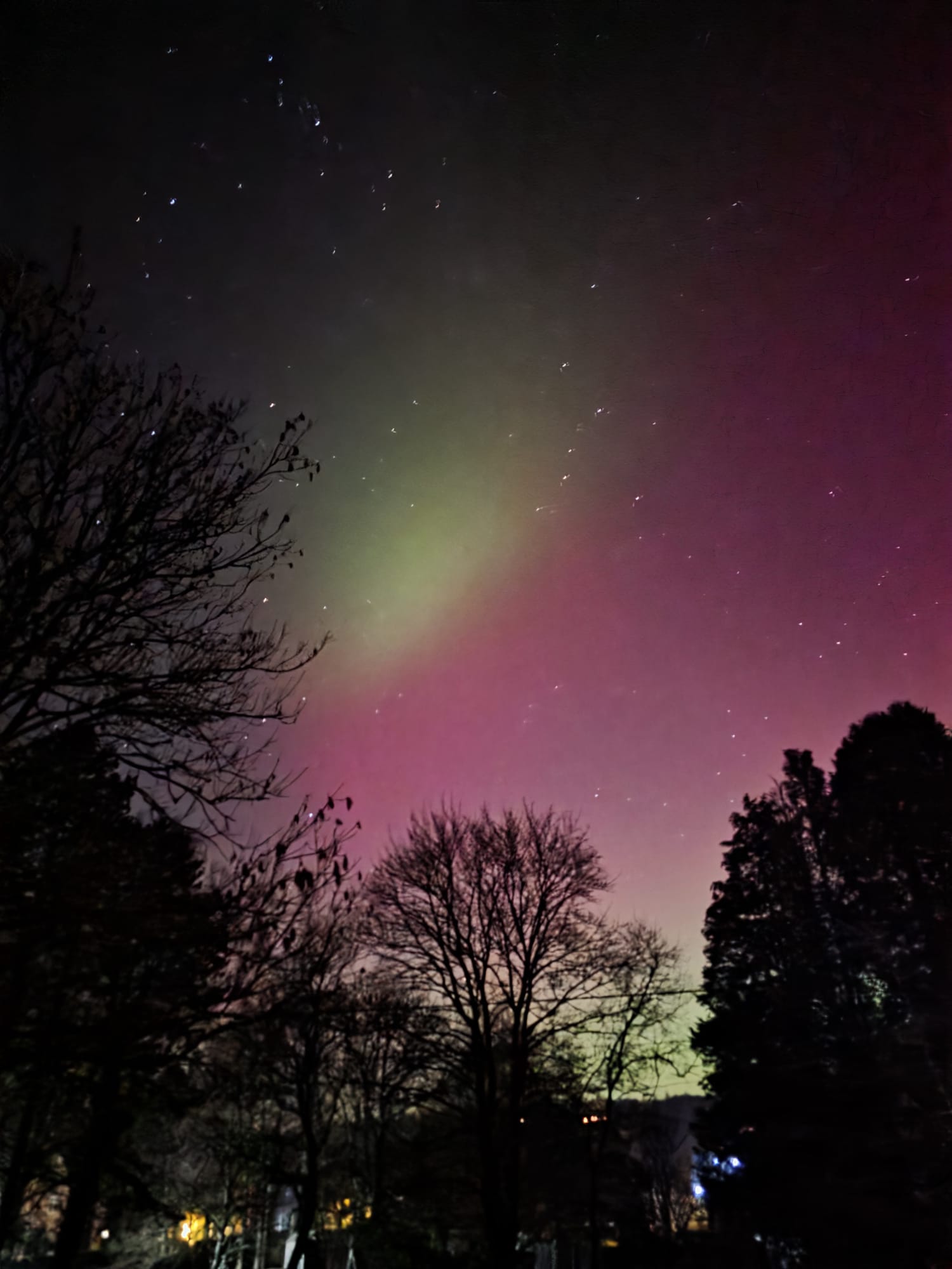 Le ciel était parfaitement dégagé au-dessus de Spa, et pour une fois, l’Europe était idéalement placée pour les observer. Un arc vert intense a également été visible de 23h à 23h30 juste au-dessus de l’horizon nord, avec des lueurs et des rayons rouges s’étendant au dessus, et ensuite de fines bandes vertes mouvantes encore plus haut.