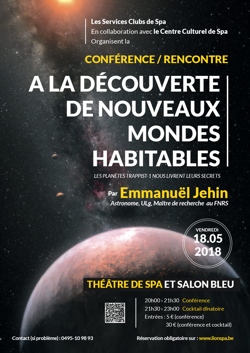 L’astronomie connaît aujourd’hui des avancées importantes dans de nombreux domaines comme celui des origines de l’Univers et de son évolution, mais un sujet passionnant et d’actualité est la découverte de planètes toujours plus nombreuses au-delà du système solaire et la recherche d’autres Terres habitables. Le 18 mai prochain, c’est un astronome de renommée mondiale de l’Université de Liège, Emmanuël Jehin, que les services clubs de Spa en coopération avec le Centre culturel de Spa vous proposent de rencontrer et ce, en toute convivialité, parce qu’il est aussi une personnalité marquante de Spa, très attaché à sa ville et au Groupe d’Astronomie de Spa (GAS) qu’il a contribué à mettre sur pied et qu’il anime avec enthousiasme et talent depuis près de vingt ans.