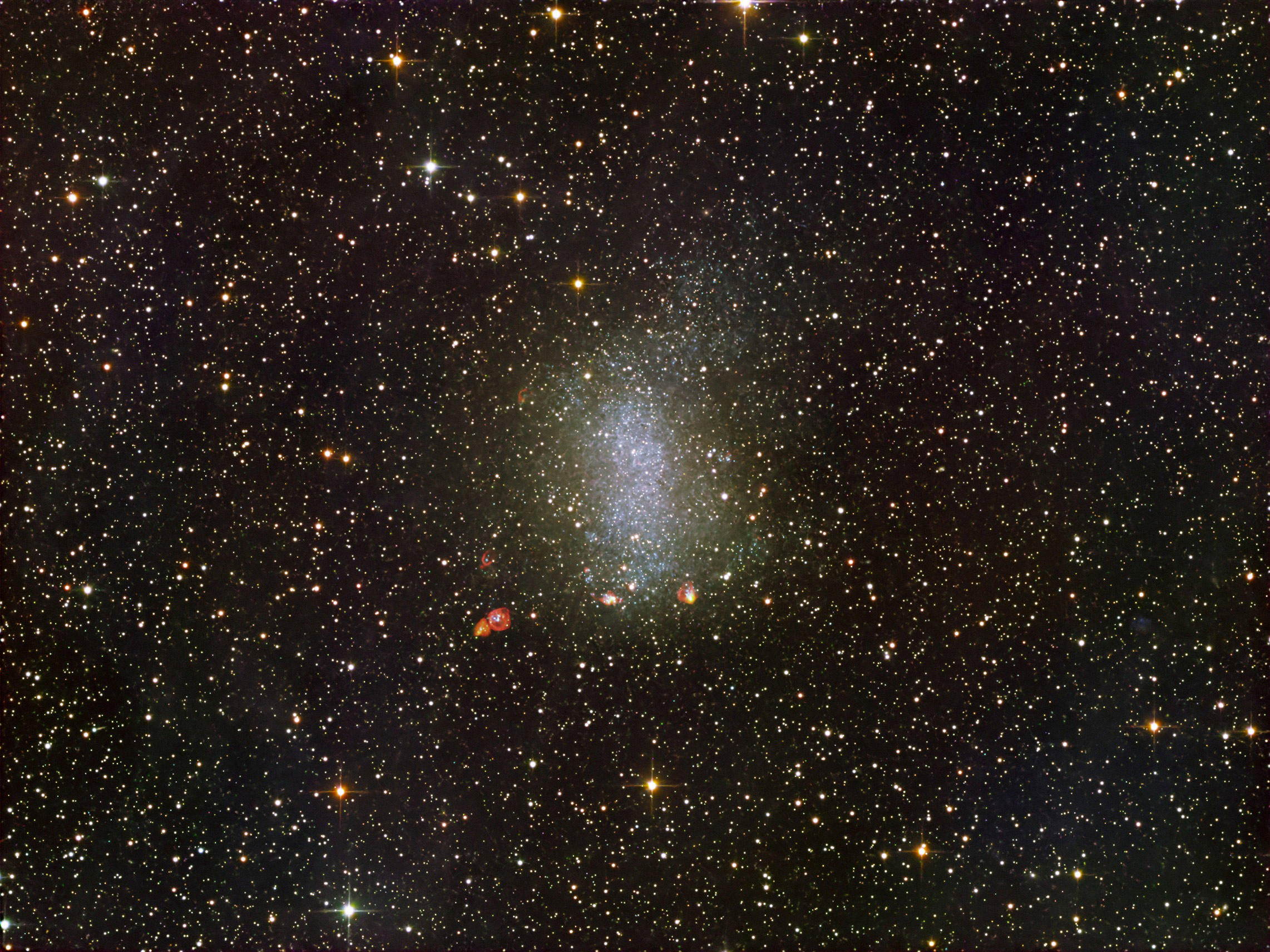 Plutôt basse sous nos latitudes et un de nos plus proches voisins galactiques, la Galaxie de Barnard (NGC 6822), un objet rarement photographié, brille derrière une mer d’étoiles dans la direction de la constellation du Sagittaire. C’est une des rares galaxies irrégulières visibles sous nos latitudes, et elle n’est pas sans ressemblance avec le Grand Nuage de Magellan. A une distance relativement proche d’environ 1,6 million d’années-lumière, la Galaxie de Barnard fait partie du Groupe Local. Sa taille est très petite au regard des standards galactiques, environ 7000 années-lumière dans sa plus grande dimension (environ un dixième de celle de la Voie Lactée), elle contient des régions riches en formation d’étoiles et de nombreuses jeunes étoiles bleues. Elle est formée d'environ 10 millions d’étoiles au total, ce qui est bien loin également des 300 milliards d'étoiles que pèserait notre Voie Lactée. Des étoiles massives très chaudes éjectant des vagues de matière et heurtant violemment le milieu interstellaire environnant sont éparpillées un peu partout dans la galaxie donnant ces curieuses petites nébuleuses compactées, rondes et colorées. Images prises en juin et août de cette année. Filtres L-R-G-B et Halpha. Poses de 120 secondes: 47 L + 69 R + 68 G + 57 B + 16 x 300 secondes en Halpha. Soit un total de 9.43 heures de pose. Télescope Skywatcher 250/1200 – Monture AZEQ6 – Caméra: ZWO 1600MM Pro – Guidage: Caméra ZWO 120 MM Mini + Lunette Artesky 70/ 400 – NINA – PHD2 – GSS – SharpCap pour Polar align. – Stellarium – Process: Pixinsight. Archives | Visitez la galerie photo |